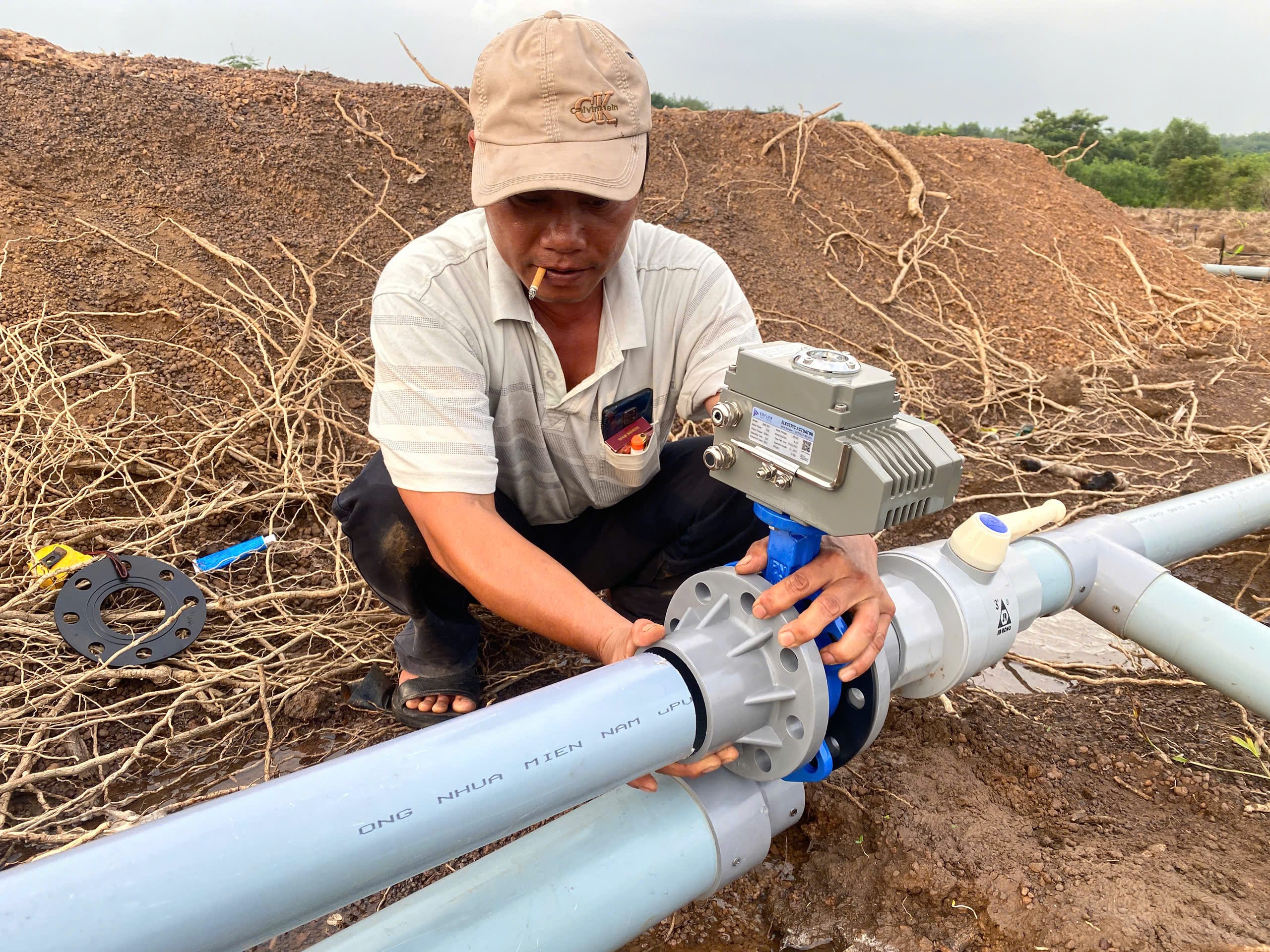 Tiếp đến là lắp đặt bộ điều khiển HT-01 Pro. Bộ điều khiển được kết nối với van điện từ không dây, hoạt động bằng năng lượng mặt trời, cho phép điều khiển từng khu tưới riêng biệt. Người trồng có thể cài đặt lịch tưới theo giờ cố định hoặc tích hợp cảm biến độ ẩm đất để tưới khi đất khô. Cách làm này không chỉ tiết kiệm nước mà còn duy trì độ ẩm lý tưởng cho chuối trong suốt quá trình sinh trưởng.